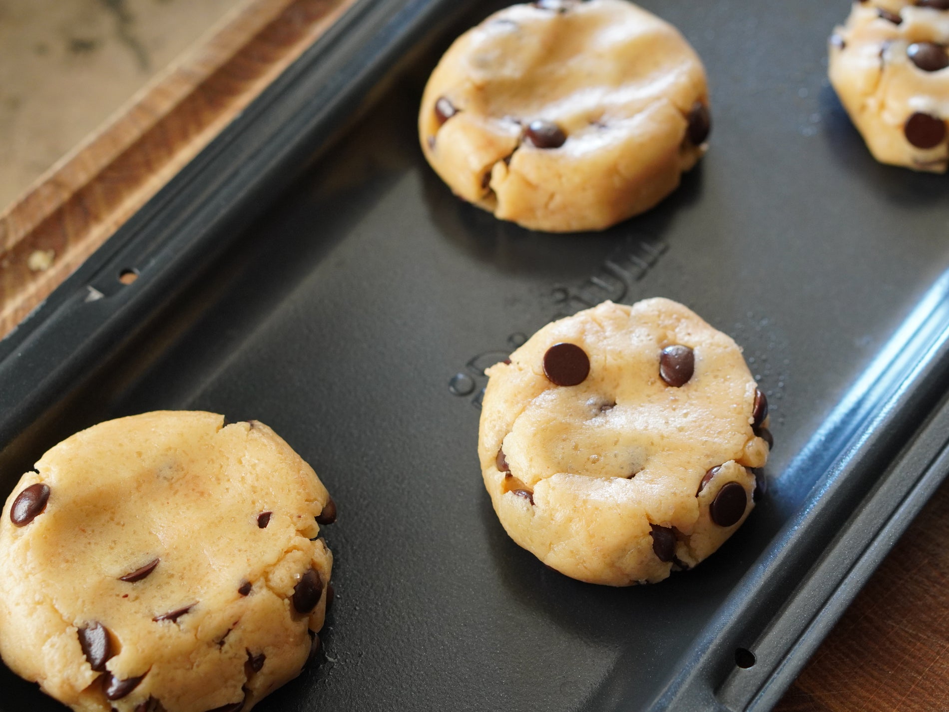 4) Roll dough into balls and place them on the OneSheet, making sure to leave space between them as they will spread while baking. Sprinkle with flaky sea salt.