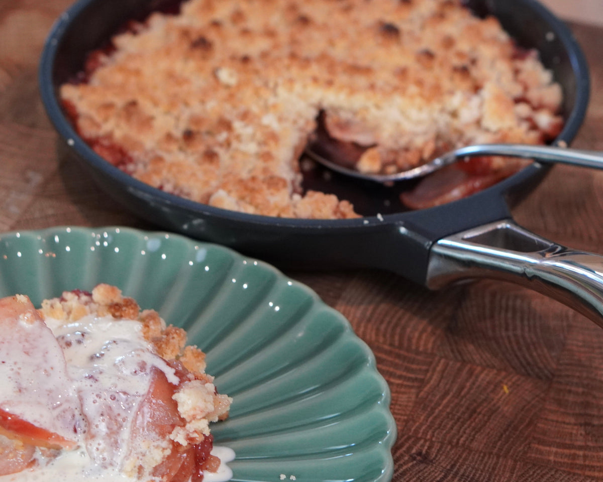 Sätt ihop och grädda: För över äppelblandningen till en OnePan 20 och sprid ut den jämnt. Strö smulblandningen över äpplena och se till att den är jämnt fördelad. Grädda i 35-40 minuter eller tills ovansidan är gyllene och fyllningen bubblar.