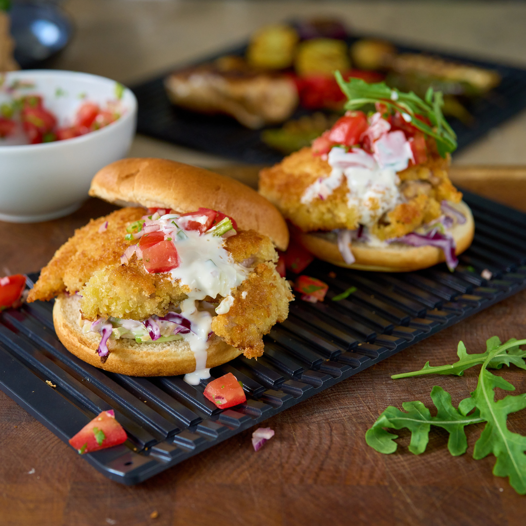 Rosta hamburgerbröden och lägg ihop hamburgarna med den kokta kycklingen, färsk salsa och yoghurtsås.