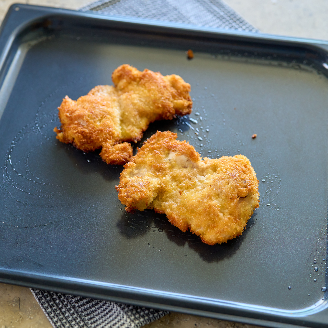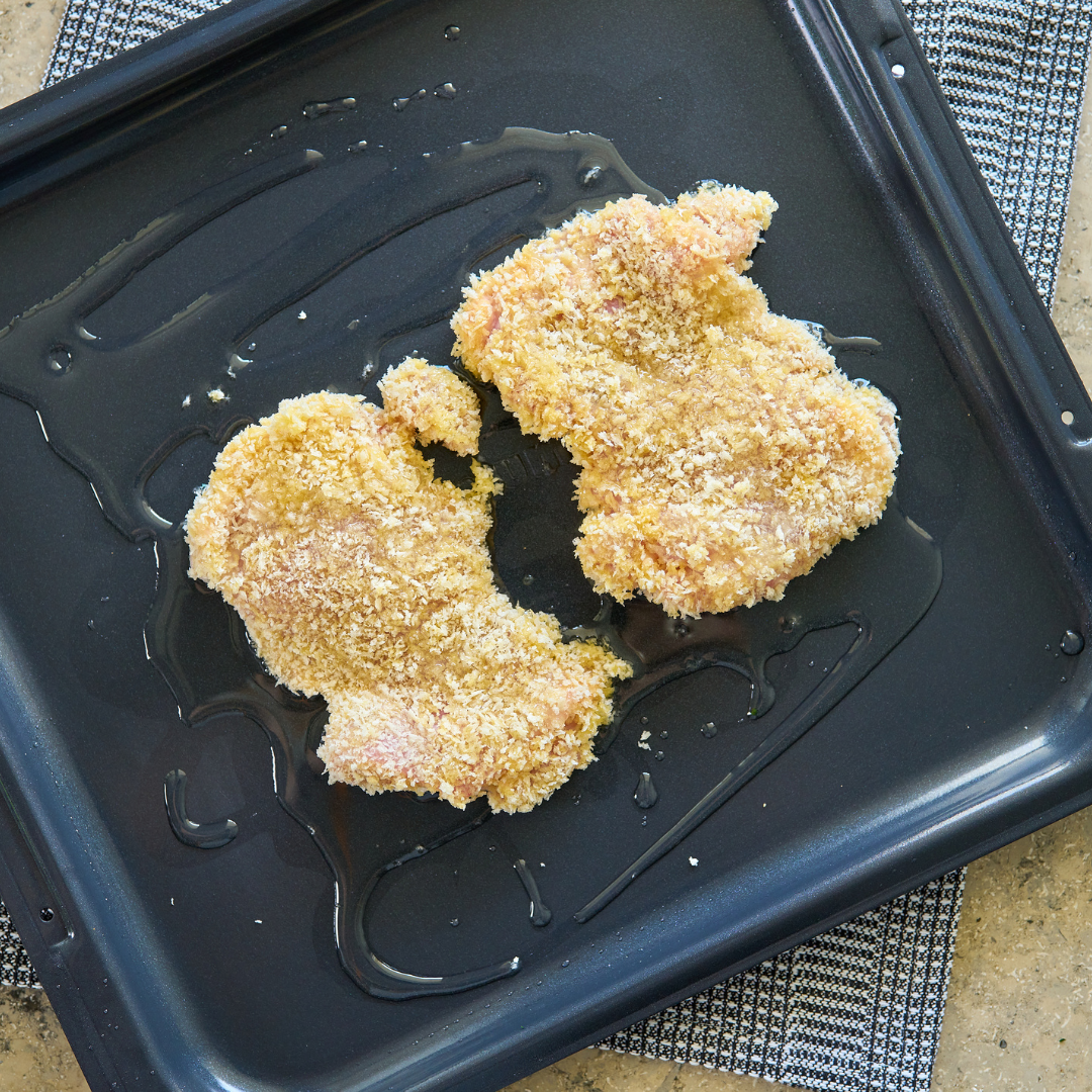 1) Doppa snabbt den panerade kycklingen i het olja.